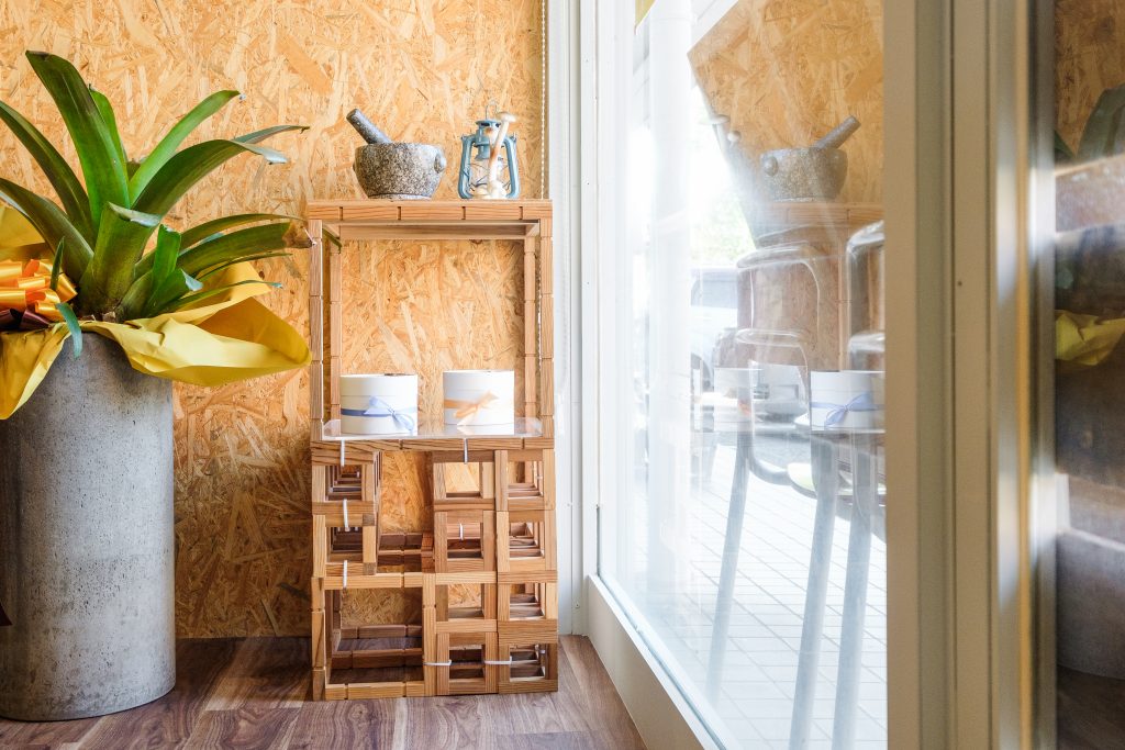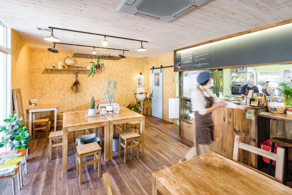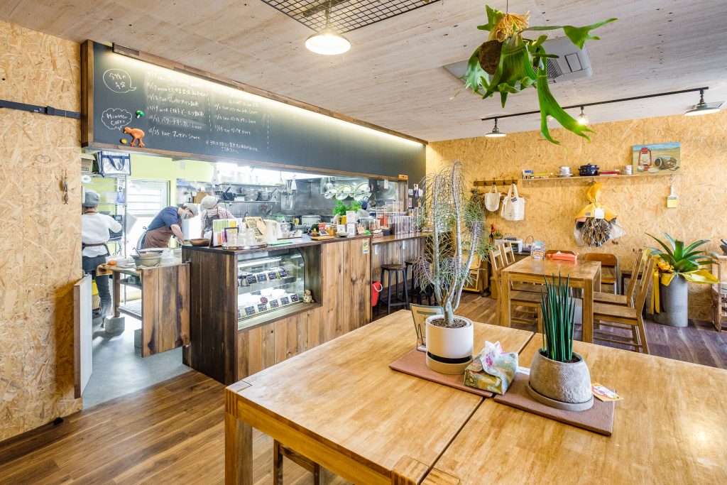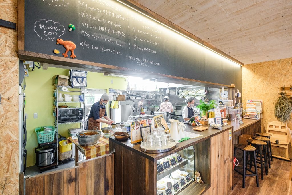 これまでテイクアウト専門店として営業をしていたひみつカレーさんが、即決即断した物件でイートインスペースが併設された店舗改修の案件。きのこ店長から「学校の図工室のような」というテーマをいただき、壁や天井を素地やDIYしたかのような塗装で仕上げ、どこか懐かしくも居心地の良い空間を表現しました。家具や什器、ドライフラワーに植栽など、はじめはシンプルだった空間が時間を経て「もの」が増え、ひみつカレーらしい空間が出来上がるようにしています。きのこ博士でスパイスにも精通しているきのこ店長のカレーは種類も豊富で元気をもらえるカレーです。